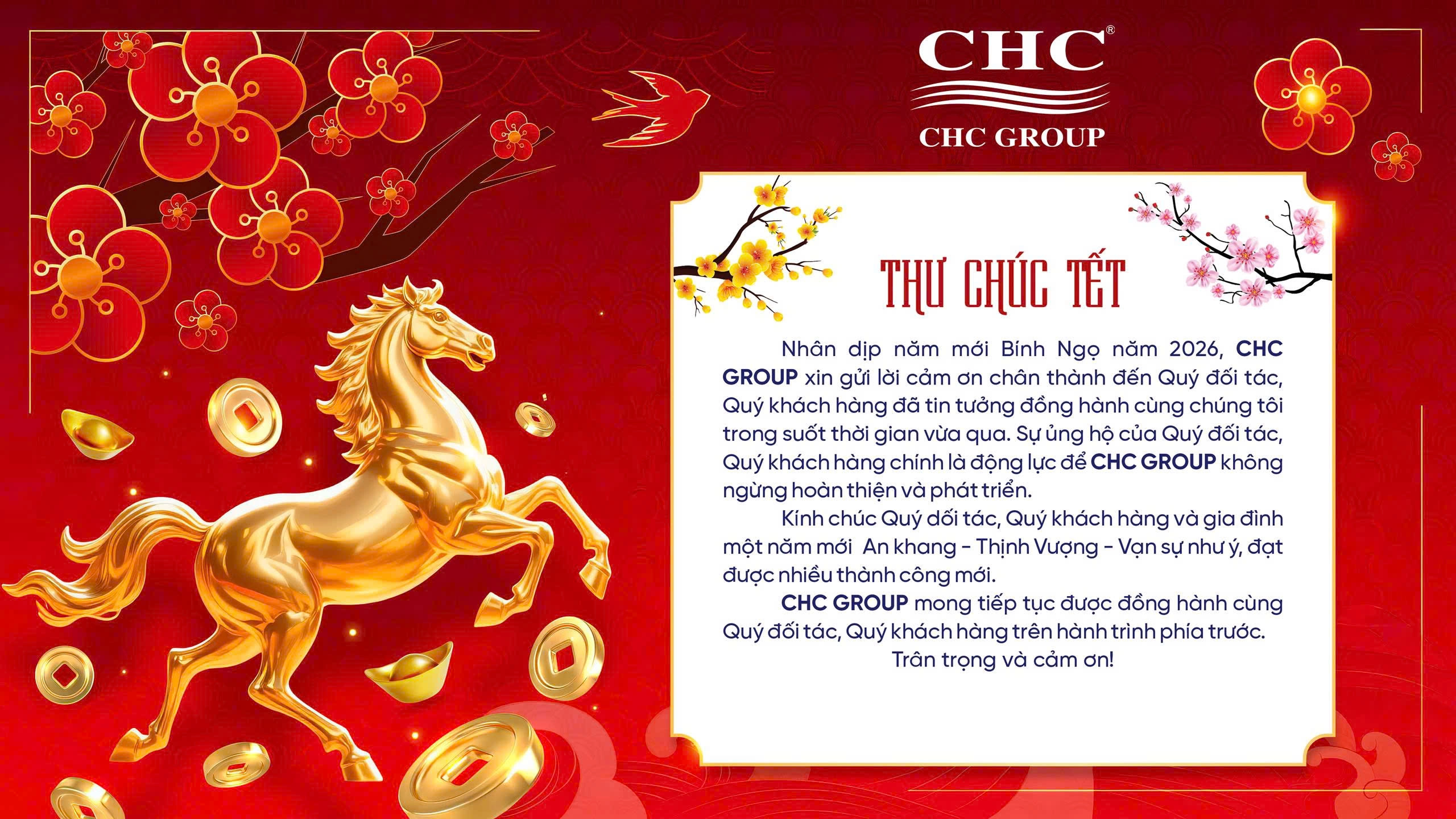Nhân dịp Xuân mới 2026, thay mặt Hội đồng Quản trị và Ban Lãnh đạo Tập đoàn CHC, tôi xin gửi tới Quý vị cùng gia đình lời chúc mừng năm mới An khang – Thịnh vượng – Vạn sự như ý.